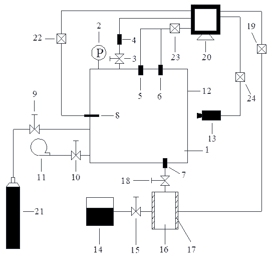 10-閥門3;11-真空泵;12-透明防爆玻璃;13-高速攝像機(jī);14-水箱;15-閥門4;16-加濕容器;17-加熱套;18-閥門5;19-加熱控制系統(tǒng);20-計(jì)算機(jī);21-可燃?xì)怏w氣瓶;22-點(diǎn)火系統(tǒng);23-壓力溫度采集系統(tǒng);24-火焰采集系統(tǒng)